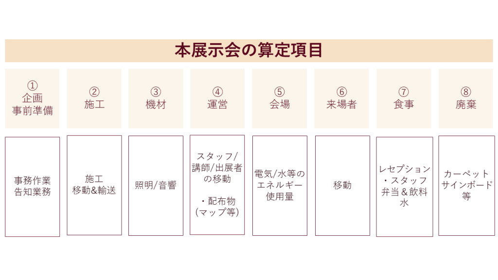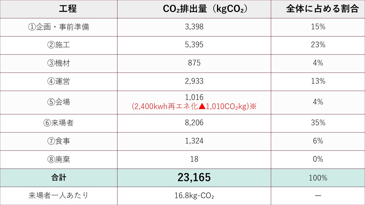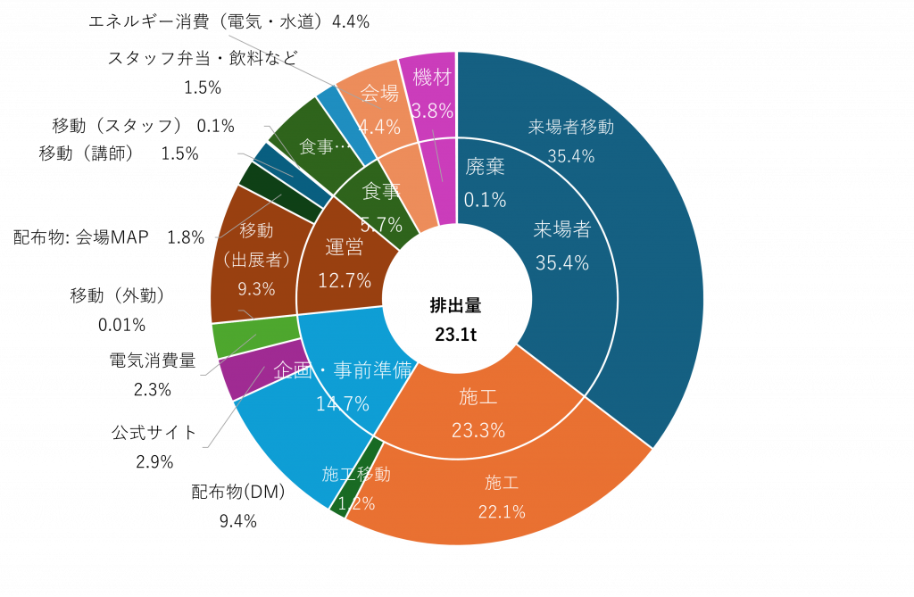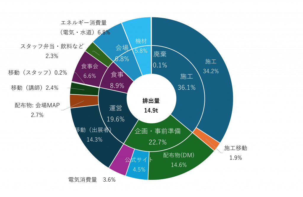 来場者の移動・宿泊を含まない場合、施工や運営に関わる印刷物・スタッフの移動などが主な排出源と考えられます。これらの項目について分析を行い、削減策を検討していくことが次のステップと考えております。